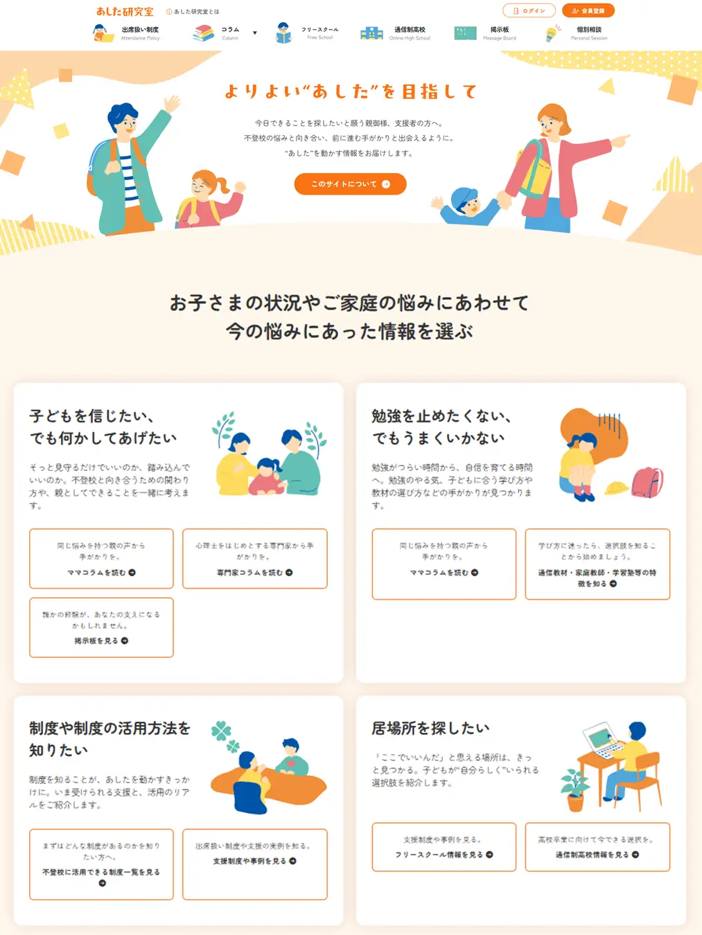 同サイトは、全国で増加し続ける不登校の子どもたちと向き合う家庭や支援者の「最初の1歩」を後押しする情報拠点。「子どもを信じたいが、何をしてあげればいいか分からない」「勉強を止めさせたくないが、うまく進まない」といった悩みに寄り添い、制度・学び・居場所に関する幅広い支援情報を分かりやすく整理してある。
