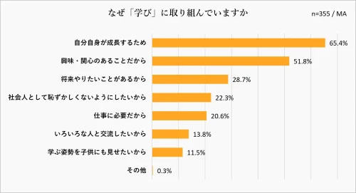 「学び」に取り組んでいる人を対象に、その理由を聞いたところ、最多は「自分自身が成長するため」が65.4%、次いで「興味・関心のあることだから」が51.8%。