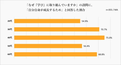 社会人はいつまで成長すればいいのか、「自分自身が成長するため」と回答した人の内訳をみると、年代に関係なく成長したいと考えていることが分かった。