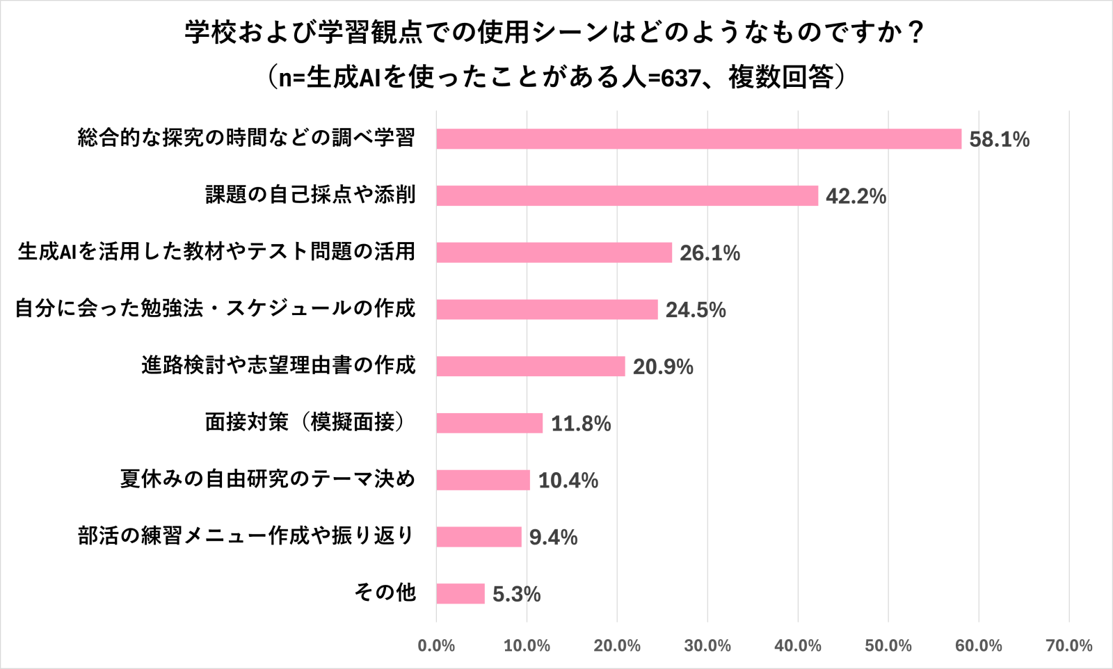 高校生に、学校や学習観点での生成AIの使用シーンを聞くと、1位「総合的な探究の時間などの調べ学習」、2位「課題の自己採点や添削」、3位「生成 AI を活用した教材やテスト問題の活用」。