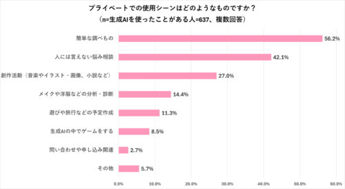 「生成 AI を使いこなす力は、将来どんな場面で役立つと思いますか?」と聞くと、上位は、 「効率的な情報収集や整理」のほか、「違う視点を持つためのヒントを得るために使う」 、また「資料の中での表現力を高めるために使う」といった、仕事での補助ツールのような活用方法をイメージしているようだ。
