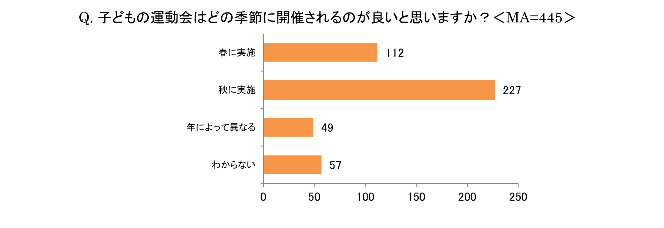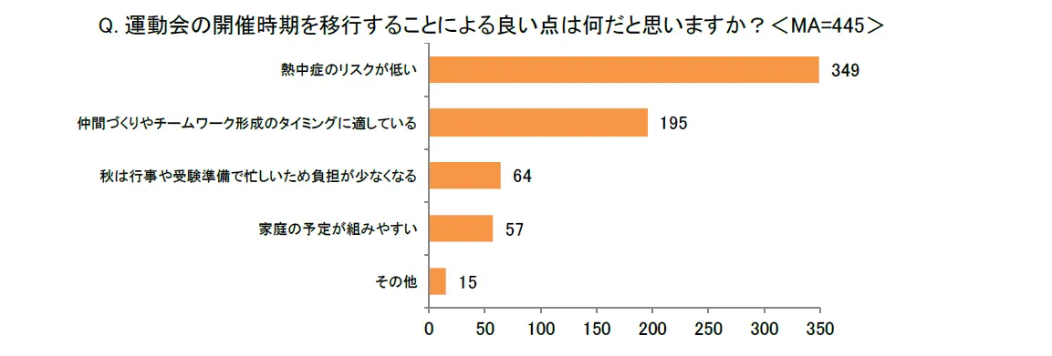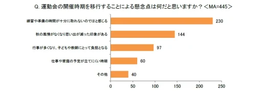 一方で、開催時期移行の懸念点として最も多かったのは、「練習の準備期間が十分に取れないのではないか」(230人)だった。開催時期の見直しは、子どもの健康面の安全性だけを重視するのではなく、関係性を深める機会や準備時間など、子どもたちにとって運動会が有意義なものとなるよう「学校現場の準備体制」も踏まえた検討が望ましく、親もその現場の実情に一定の理解があることが伺える結果となった。