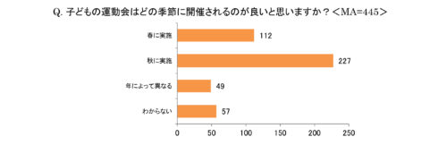 それによると、「子どもの運動会はどの季節に開催されるのが良いと思うか?」と聞いたところ、「春」(112人)を上回り、「秋」(227人)が最多となった。さらに、「年によって異なる」(49人)、「わからない」(57人)という回答もあり、運動会の開催時期について一概に「春」または「秋」と決めきれないと考える親も一定数いた。