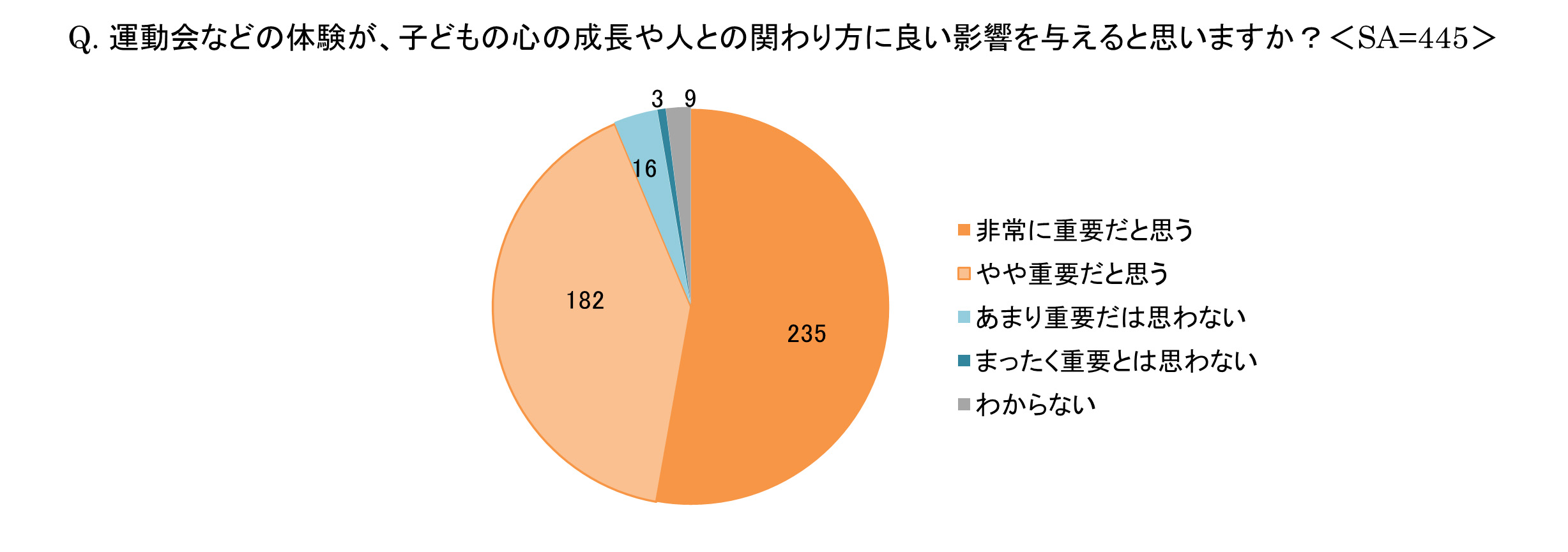 さらに、「運動会などの体験が、子どもの心の成長や人との関わり方に良い影響を与えると思うか?」と尋ねたところ、「非常に重要」と回答した親が半数以上、「やや重要」が約4割と、合わせて約9割の親が「運動会は子どもの心の成長や人との関わり方に良い影響がある」と考えていることが判明した。