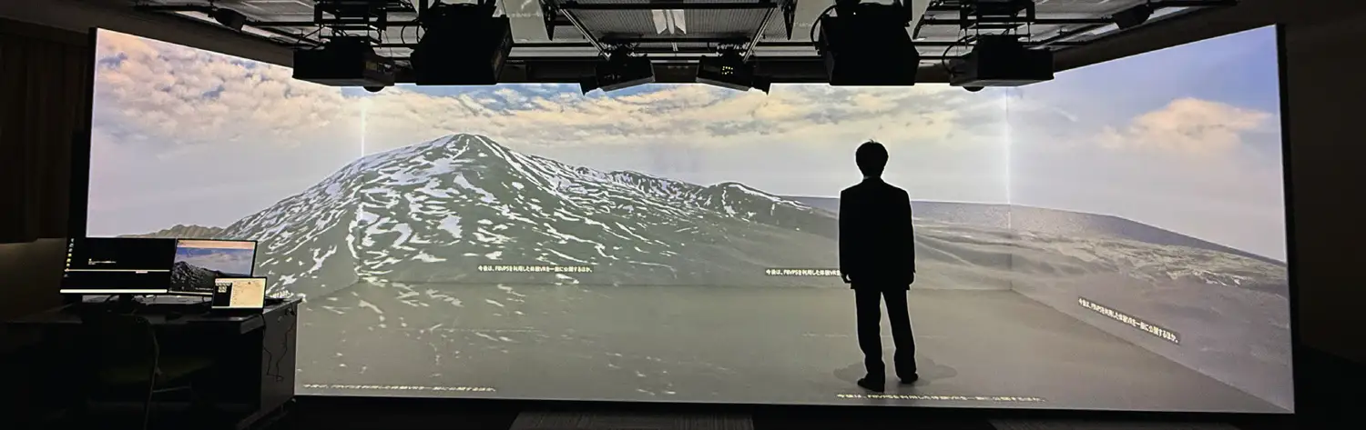 同システムは、同大情報データ科学部1号館のAI研究推進センター内に設置されており、横幅8m×高さ2.5m、前後・左右・床面に8台のプロジェクタによる大規模投影が可能なXRシステム。