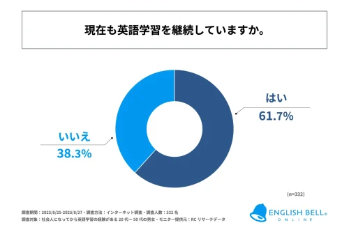 それによると、「現在も英語学習を継続しているか」の問いでは、「はい」が61.7%、「いいえ」が38.3%だった。