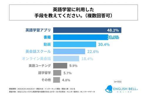 「英語学習に利用した手段」の問いでは、1位が「英語学習アプリ」48.2%、2位が「書籍」38.9%、3位が「動画」30.4%だった。