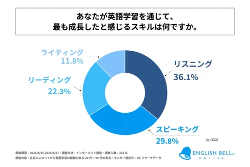 「英語学習を通じて、最も成長したと感じるスキル」の問いでは、1位が「リスニング」36.1%、2位が「スピーキング」29.8%、3位が「リーディング」22.3%だった。