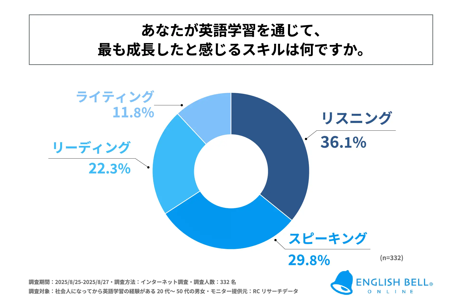 「英語学習を通じて、最も成長したと感じるスキル」の問いでは、1位が「リスニング」36.1%、2位が「スピーキング」29.8%、3位が「リーディング」22.3%だった。