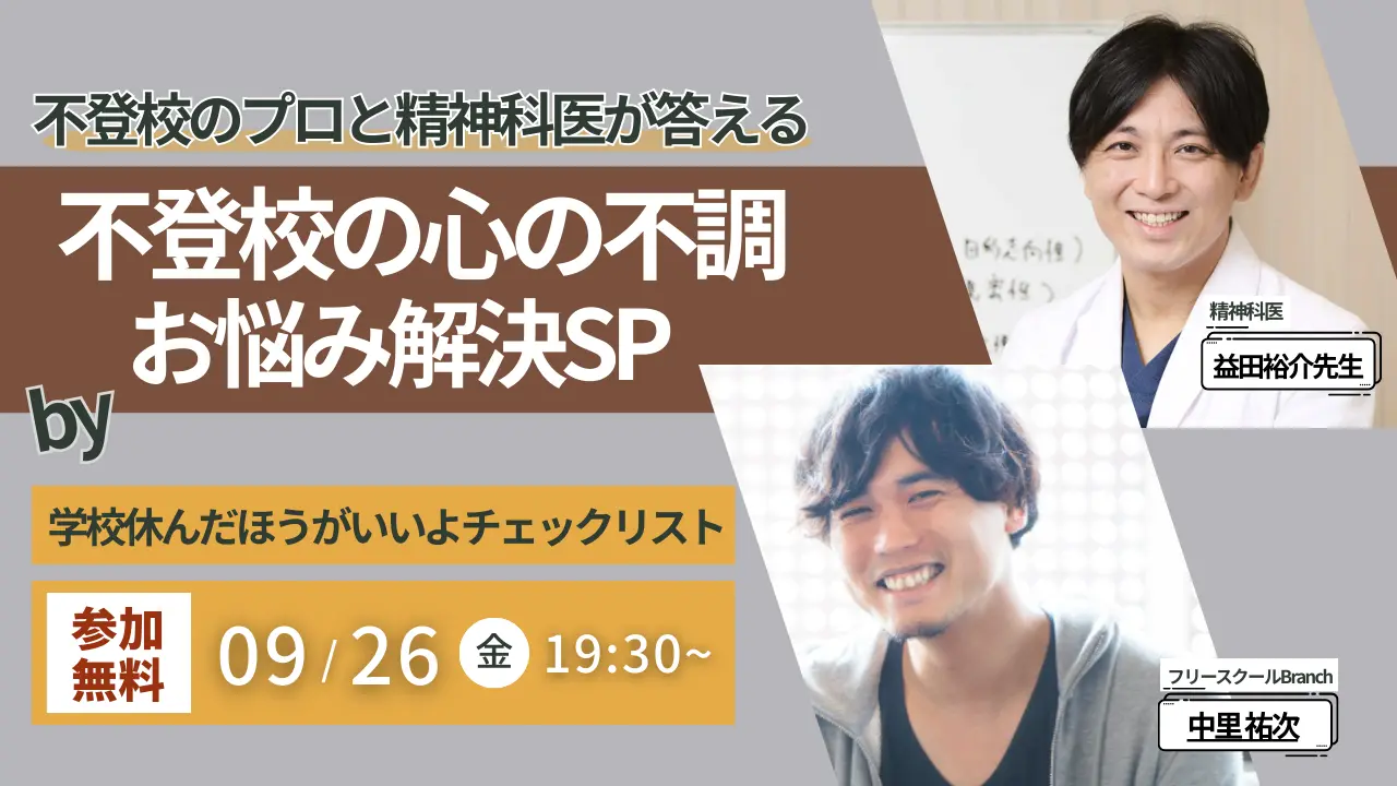 「学校休んだほうがいいよチェックリスト」を運営する不登校ジャーナリスト・石井しこう氏、オンラインフリースクール「Branch」、不登校の子どものための完全個別指導塾「キズキ共育塾」の3者は、児童精神科医の益田裕介氏を招いて無料オンライン講演会を26日に開催する。
