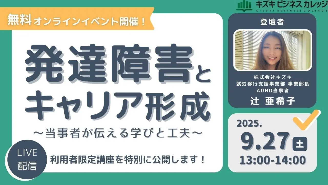 就労移行支援事業所・キズキビジネスカレッジは、キャリア形成に悩む発達障がいのある人へ向けた無料オンライン講座を27日に開催する。
