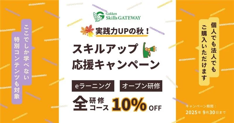 キャンペーン中にクーポンコード「TOASU2509」を入力すると、Gakken Skills GATEWAYで提供しているすべての研修コースを一律10%オフで購入できる。