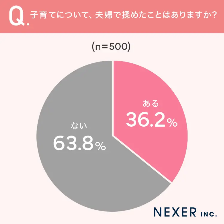 それによると、「子育てで夫婦で揉めたことはあるか」と聞いたところ、36.2%が「ある」と回答。「ない」が63.8%で、半数以上は「揉めたことがない」と回答しており、子育てに関して夫婦間の意見が一致している家庭が多いのが分かる。しかし、およそ3組に1組の夫婦は子育てを巡って対立を経験しているようだ。
