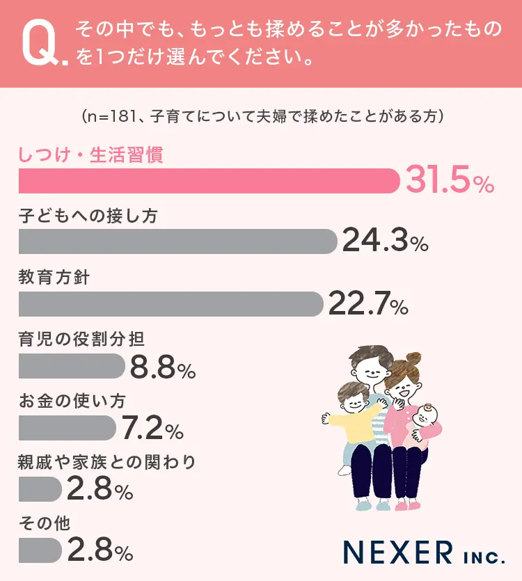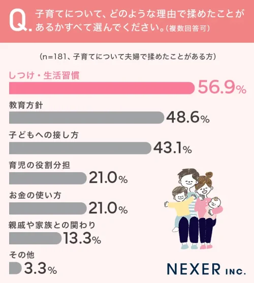 子育てに関する夫婦の揉めごと、TOP3は「しつけや生活習慣」「教育方針」「子どもへの接し方」=NEXER調べ=