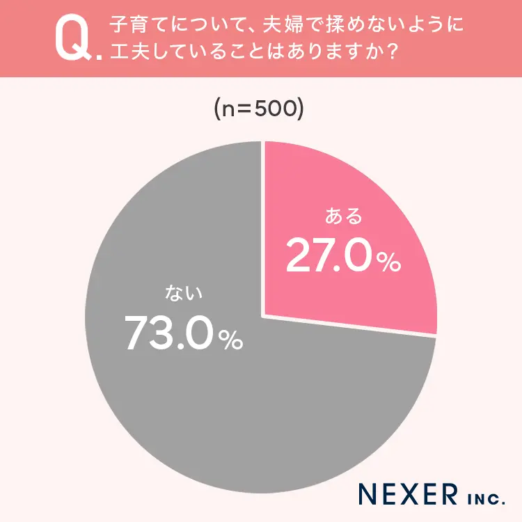 一方、「子育てについて夫婦で揉めないように工夫していることはあるか」と尋ねたところ、「ある」と答えたのは27.0%で、73.0%が「ない」と回答。揉めないように工夫している夫婦は3割弱にとどまった。