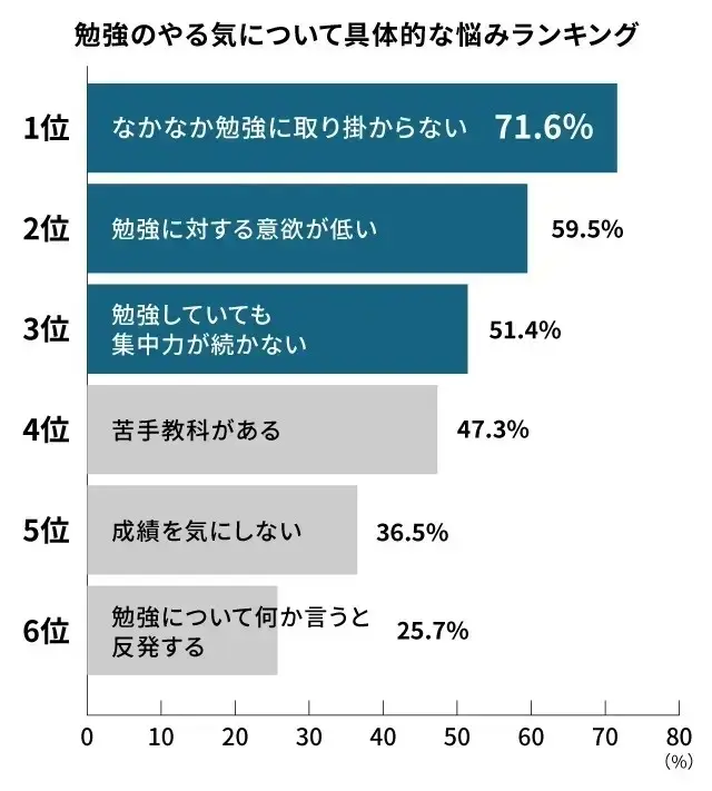 保護者が抱えている具体的な悩みを複数回答形式で尋ねたところ、最も多かった悩みは、「なかなか勉強に取り掛からない」で71.6%。次いで多かったのは、「勉強に対する意欲が低い」で59.5%、「勉強していても集中力が続かない」が51.4%と続いた。