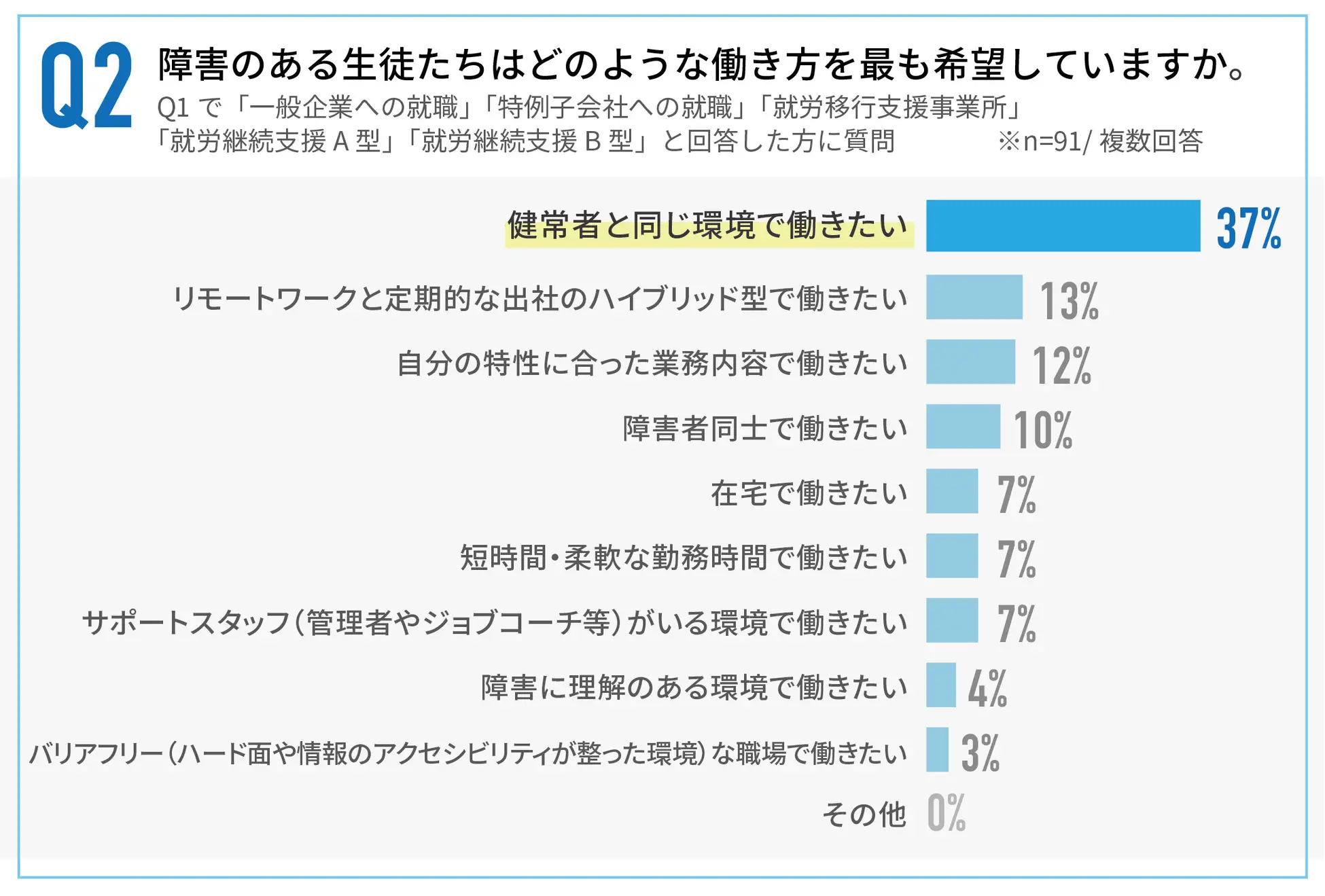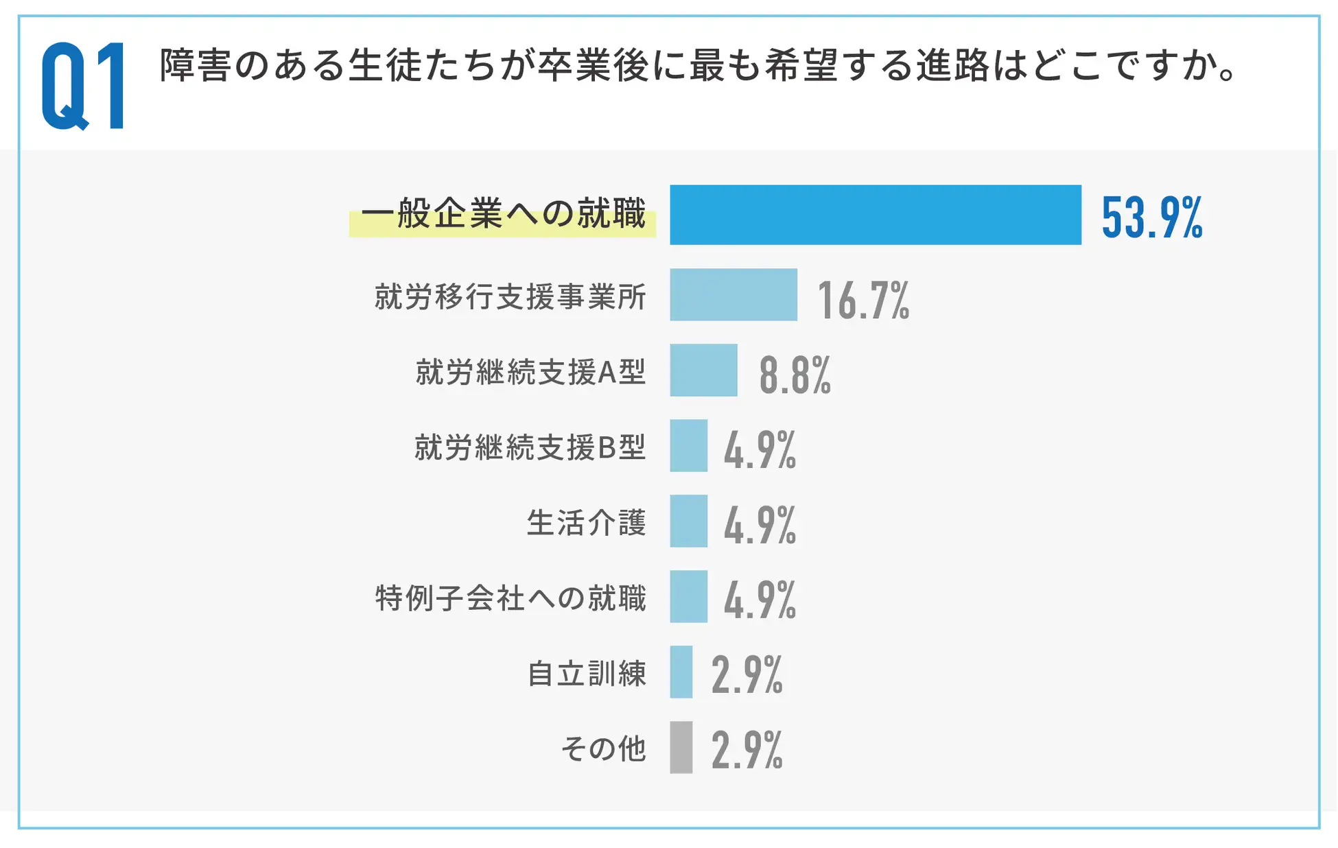 調査は、障がいのある生徒の進路指導に携わる教員102名を対象に、7月30日~8月1日に行われた。それによると、障害のある生徒たちが卒業後に最も希望する進路は「一般企業への就職」で53.9%を占めた。また、希望する働き方は「健常者と同じ環境で働きたい」が37%で最多となった。