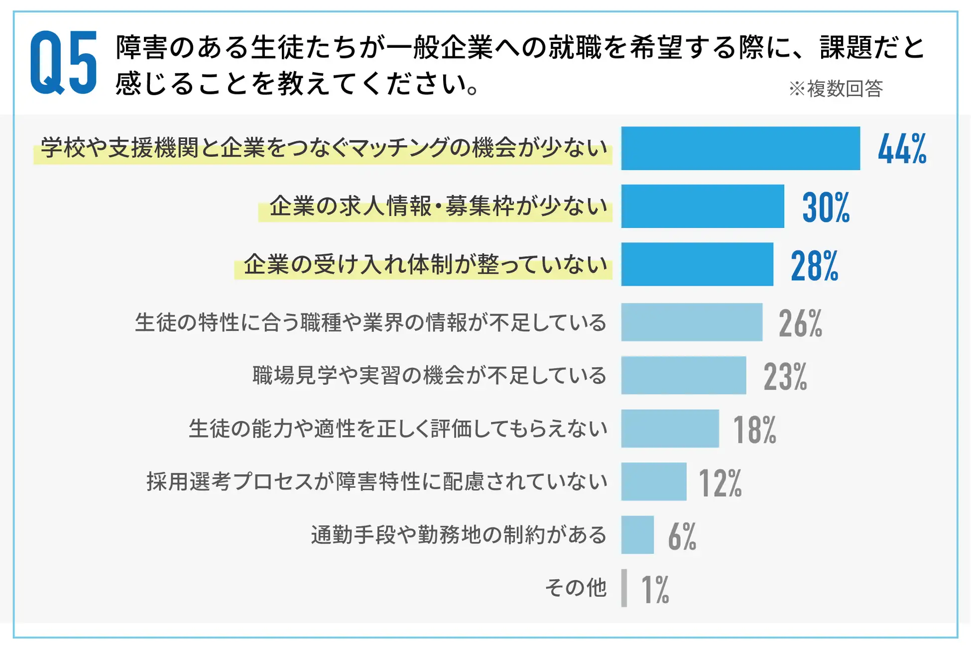 また、一般企業への就職を希望する際の課題としては、「学校や支援企業と企業をつなぐマッチングの機会が少ない」が44%で最も多く、「企業の求人情報・募集枠が少ない」「企業の受け入れ体制が整っていない」と続いた。