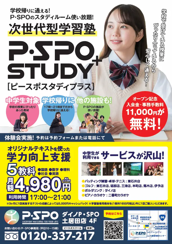 三福ホールディングスが運営するスポーツジム「P・SPO」(ピースポ)は、10月1日に、学習とエンタメを両立した中学生向けの次世代型学習塾「P・SPOスタディ+(プラス)」を、愛媛県松山市のダイノP・SPO土居田店4階に開校する。