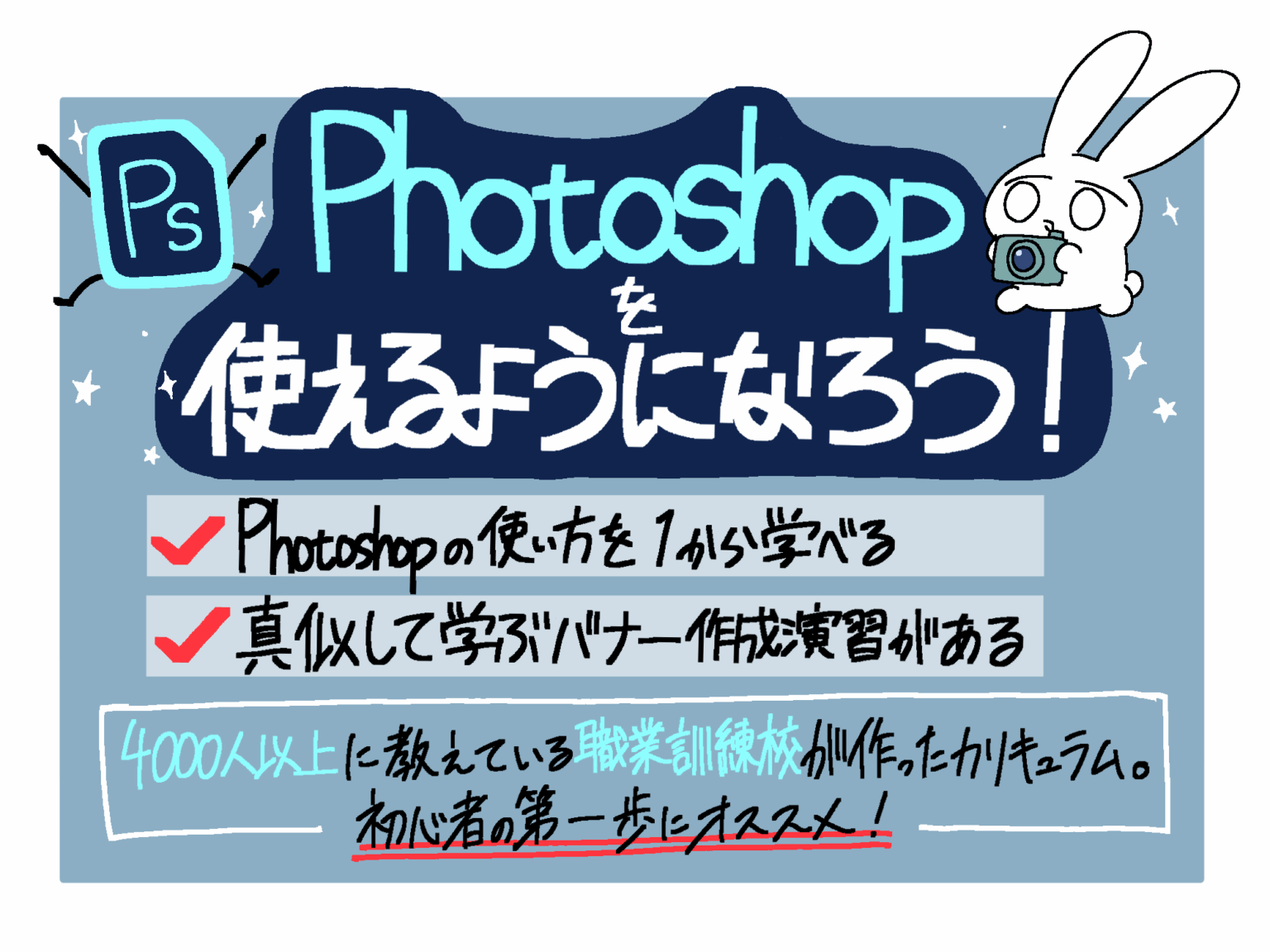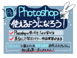 まったくの未経験からAdobe Photoshopを学ぶ講座で、各ツールの基本的な操作から、1つひとつ学習を進めていく。