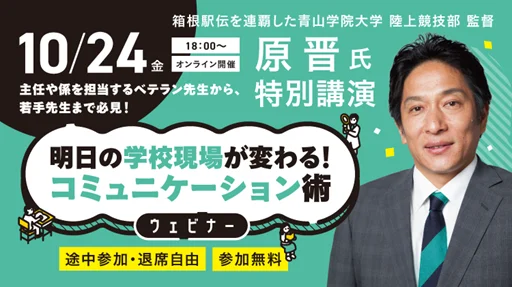 ベネッセコーポレーションは、青山学院大学 地球社会共生学部教授・陸上競技部監督の原晋氏を講師に招き、「学校現場のコミュニケーション術」をテーマにした小中学校教員向け無料ウェビナーを10月24日に開催する。