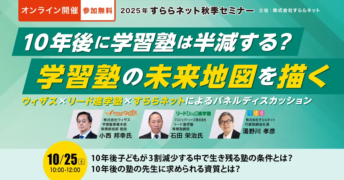 すららネットは、2025年すららネット秋季セミナー「10年後に塾は半減する?学習塾の未来地図を描く」を、10月25日にオンラインで開催する。