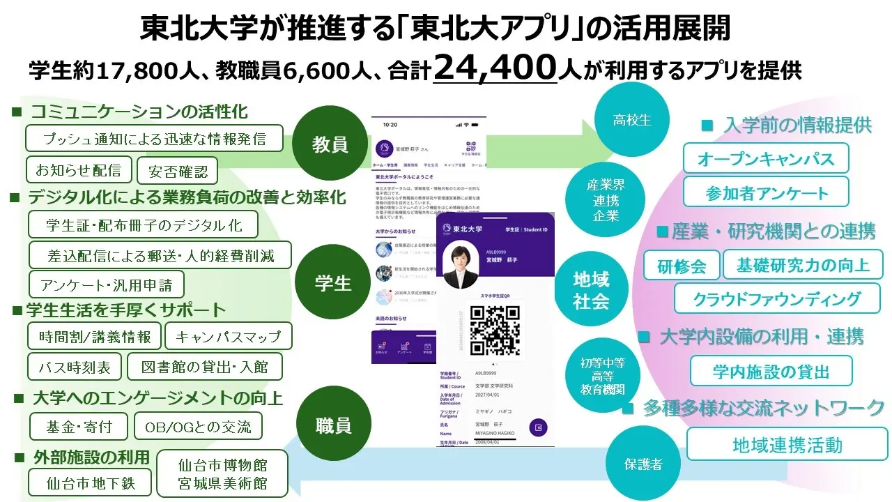 同アプリは、4月から運用を開始。学生約1万7800人、教職員約6600人、合わせて約2万4400人が利用可能なスマホ学生証・職員証機能を中核としたデジタル基盤。