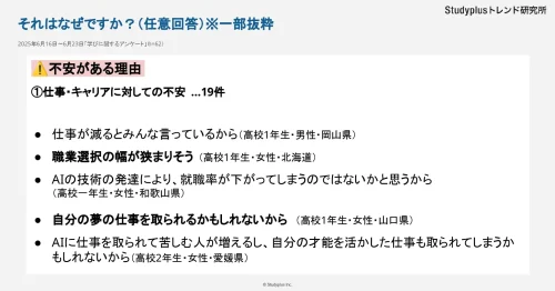 調査はStudyplusユーザーの高校1・2年生を対象に6月16日~23日に行われ、298名から回答を得た。それによると、高校生の6割がAIが広がることについて「不安」と回答した。その理由を自由回答形式で訊ねたところ、AIによって「仕事が奪われるのではないか」「思考力が低下するのではないか」という声が多く聞かれた。