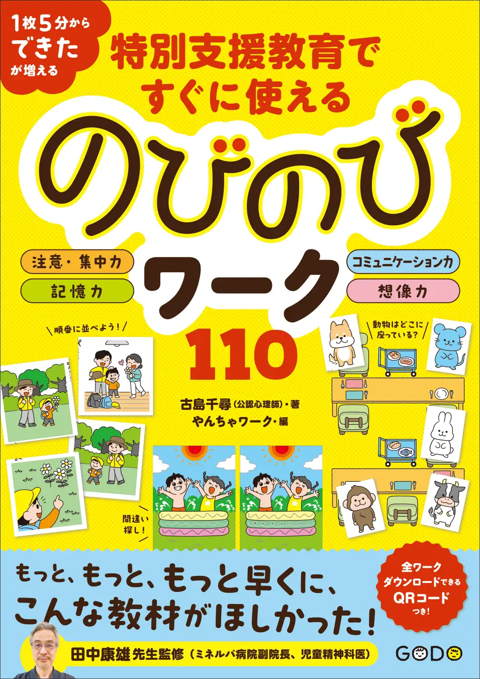 同書は、公認心理師・保育士が運営する人気サイト「やんちゃワーク」から生まれたワーク集で、集中したり、注意を切り替えたりすることが苦手、見たり聞いたりしたことを覚えるのが苦手、頭の中で物事をイメージするのが苦手、人とのコミュニケーションに不安がある……、といった子どものために、楽しみながら取り組める110のワークを収録。