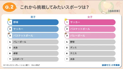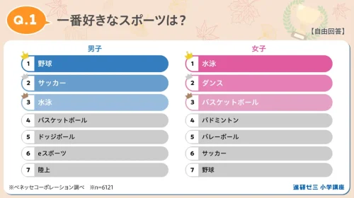 調査は進研ゼミ小学講座の利用者を対象に9月26日~29日に行われ、小学3~6年生の男女7182名から回答を得た。それによると、一番好きなスポーツは、男子が野球とサッカーが上位に、女子が水泳、ダンス、バスケットボールがランクインした。
