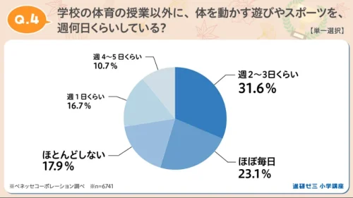学校の体育の授業以外に「週に2~3日くらいスポーツをしている」と答えた子どもが約3割で最多となり、次いで「ほぼ毎日」23.1%と続いた。一方で「ほとんどしない」と答えた子どもも17.9%に上り、運動習慣のある子とそうでない子の二極化が窺える結果となった。