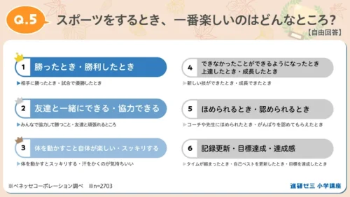 スポーツをするとき、一番楽しいのはどんなことかと訊ねたところ、1位は「勝ったとき・勝利したとき」、続いて2位「友達と一緒にできる・協力できる」、3位「体を動かすこと自体が楽しい・スッキリする」となった。