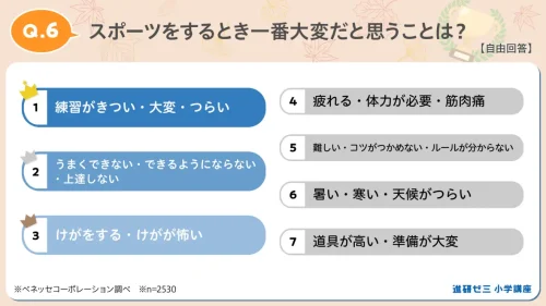 また、スポーツをするとき一番大変だと思うことを訊ねたところ、1位「練習がきつい・大変・つらい」、2位「うまくできない・できるようにならない・上達しない」、3位「けがをする・けがが怖い」と続いた。