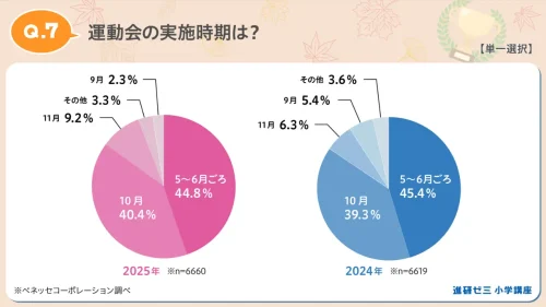運動会の実施時期は、「5~6月ごろ」44.8%が最も多く、次いで「10月」40.4%となった。秋実施については暑さのせいで、前年より9月が減少し11月が増加する結果となった。