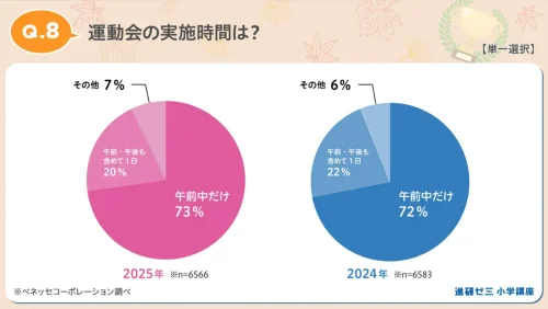 また、運動会の実施時間については「午前中だけ」が73%と最多で、ほぼ前年と同じとなった。