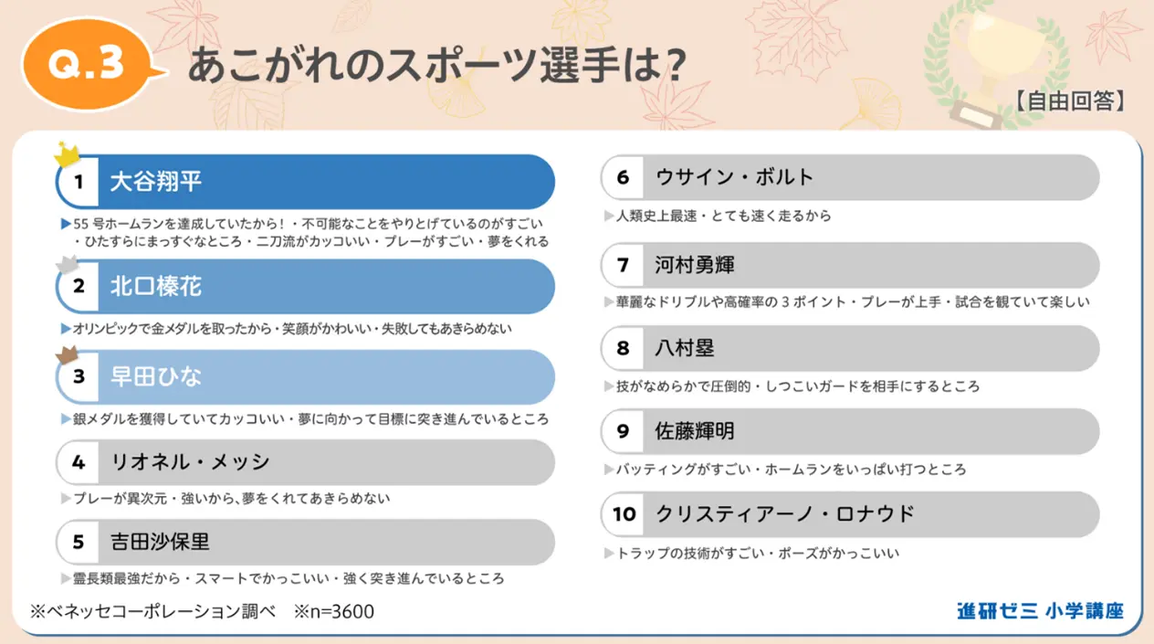 憧れのスポーツ選手では、大谷翔平選手が圧倒的な支持を集めて1位となった。