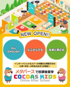 COCOASは7日、インターナショナルスクール卒園生および帰国子女を対象にした、メタバース活用のオンライン英語学童「COCOAS KIDS Online After School」を11月から開始すると発表した。