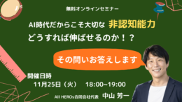 同セミナーでは、幼児教育や小中高校の教員、一般の児童・生徒や保護者を対象とした講演会の回数は年間200件を超える実績を持つAll HEROS 代表の中山氏を迎え、「非認知能力とは何か」を基礎から改めて学び直す。非認知能力の最新の捉え方や中学・高校生はどうすれば非認知能力が伸びるのかを紹介する。
