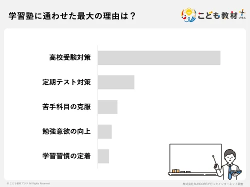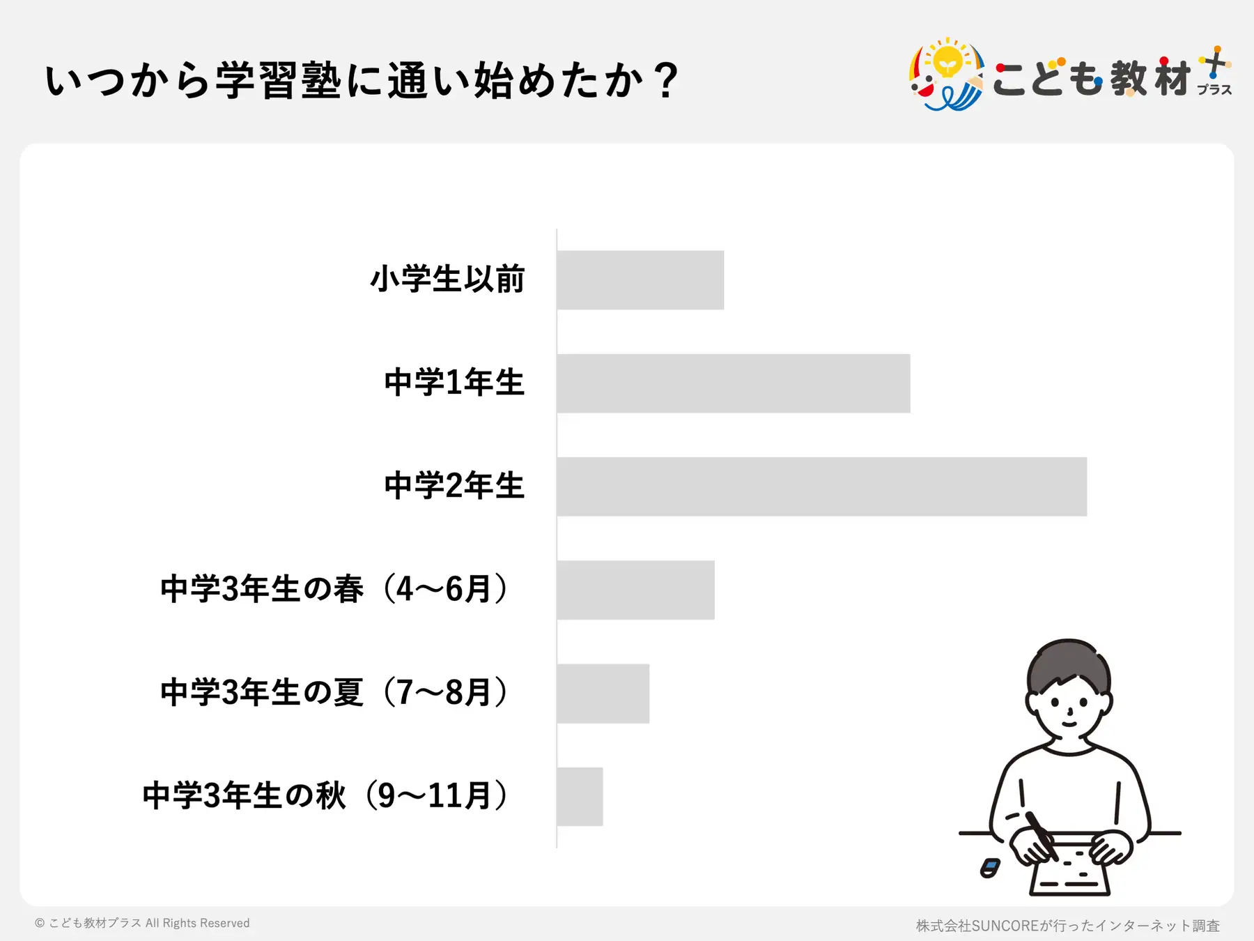 SUNCOREは7日、同社が運営する教育Webメディア「こども教材プラス」が、中学校を卒業した子どもを持つ保護者156人を対象に実施した、「中学生の通塾事情に関するアンケート調査」の結果をまとめ発表した。