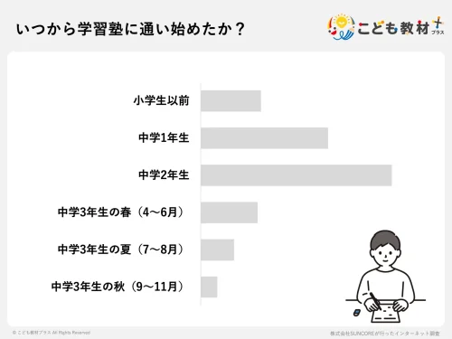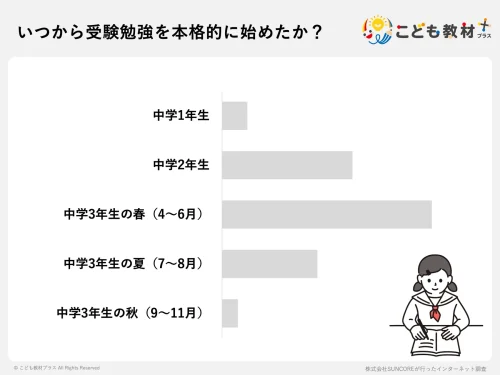 一方、通塾を始めた時期を聞いたところ、最も多かったのは「中学2年生」(57人)だったが、本格的な受験勉強の開始時期は「中学3年生の春」(66人)が最多となっており、多くの家庭が受験本番の1年前から塾を活用して対策を始めていた。