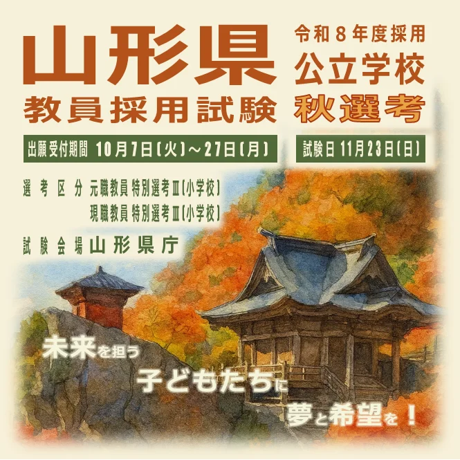 山形県教育委員会は8日、他県から「山形県へ戻りたい」「山形県へ移住したい」と考えている教員のニーズに応えるため、2026年(令和8年)度採用山形県公立学校教員選考試験の秋選考を初実施することを発表した。