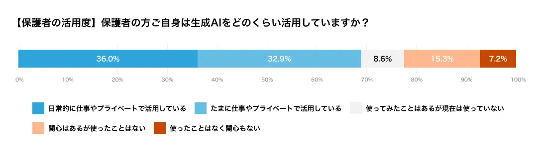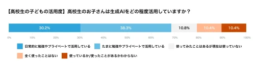 それによると、調査では、高校生の保護者の69%が生成AIを「日常的に」または「たまに」利用していると回答。子どもの利用状況についても同じく69%が「日常的に」または「たまに」使用していると答えている。
