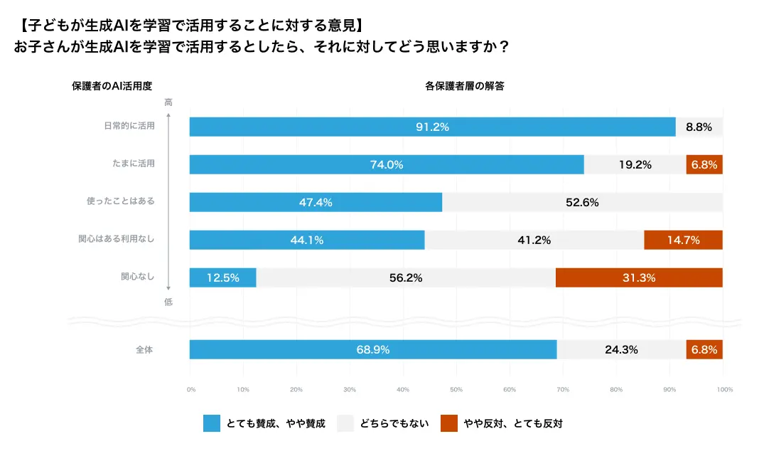 子どもが学習で生成AIを使うことについては、保護者全体の69%が「賛成」または「やや賛成」と回答。保護者自身の利用度が高いほど、子どもの利用にも前向きである傾向が見られ、自分が「日常的に使う」と答えた保護者の91%が賛成し、「たまに使う」と答えた保護者でも74%が賛成している。