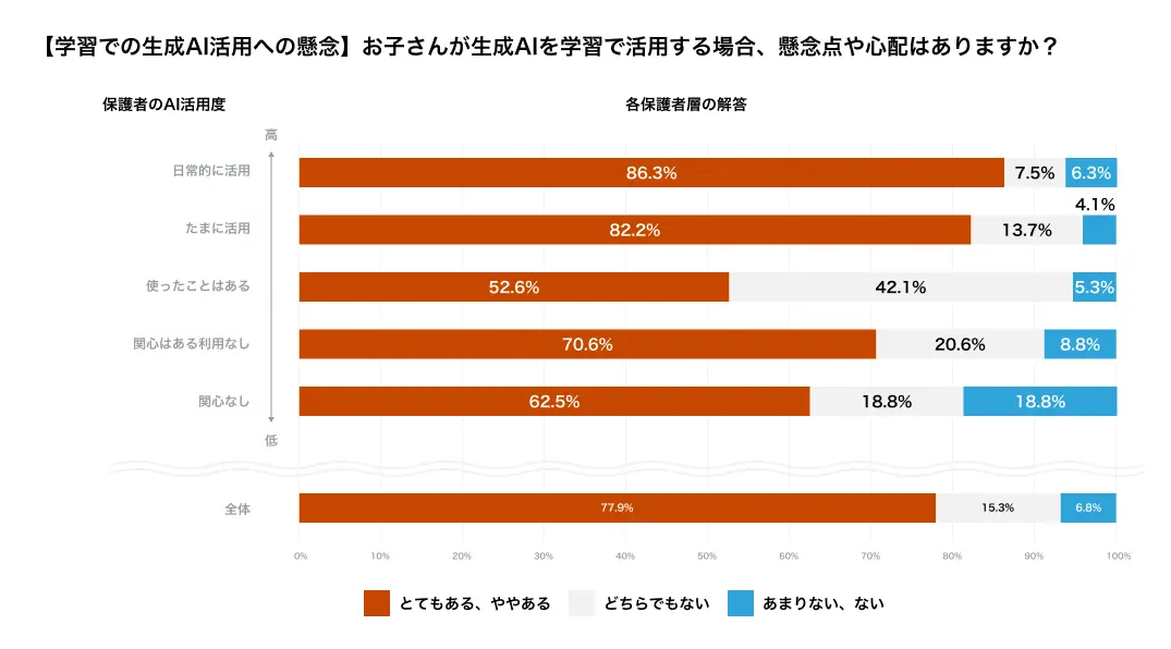 懸念も見られた。全体の77%の保護者が生成AIを使うことに対しての懸念が「とてもある」「ややある」と回答しており、特に「日常的に使う」と答えた保護者では86%が懸念を持っていた。