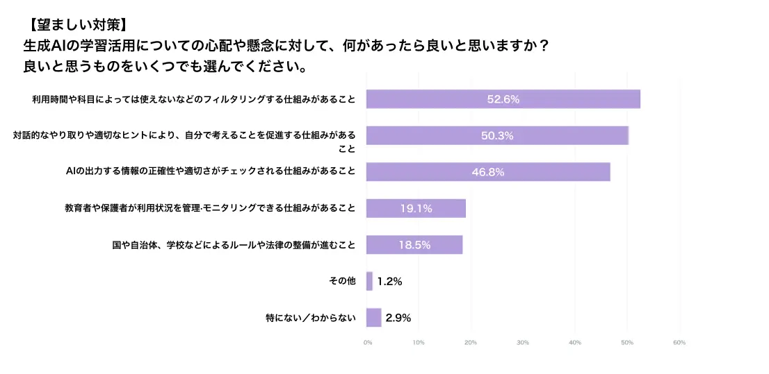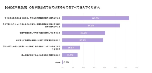 懸念内容として最も多かったのは、「すぐに答えを求めるようになり、考える力や問題解決力が育たなくなる」(63%)、「自分で調べたり考えたりする機会が減り、困難な課題に粘り強く取り組む姿勢が育たない」(54%)といった学習姿勢への影響だった。