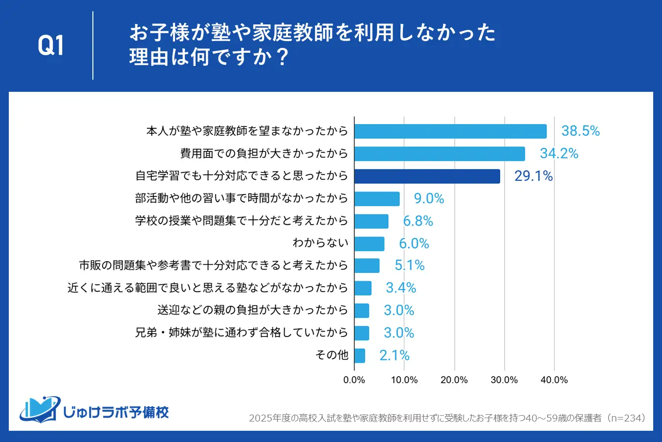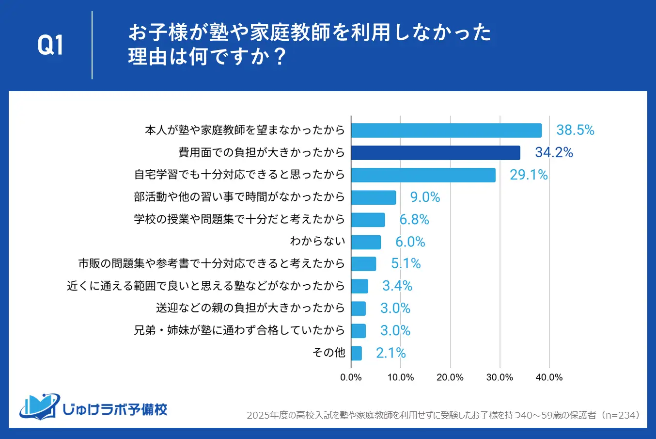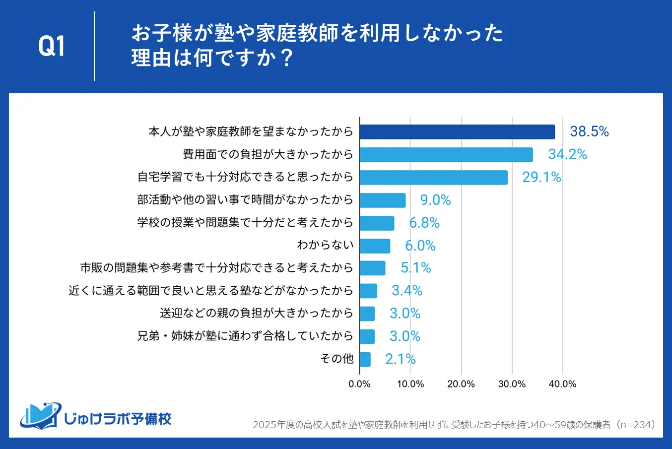 エンライクが運営する「じゅけラボ予備校」は14日、2025年度の高校入試を塾や家庭教師を利用せずに受験した子どもを持つ40~59歳の保護者234人を対象に実施した、「塾・家庭教師を利用しなかった理由」に関するアンケート調査の結果をまとめ発表した。