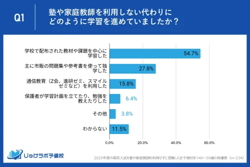 エンライクが運営する「じゅけラボ予備校」は15日、2025年度の高校入試を塾や家庭教師を利用せずに受験した子どもを持つ40~59歳の保護者234人を対象に実施した、「塾なしでの学習方法」に関するアンケート調査の結果をまとめ発表した。