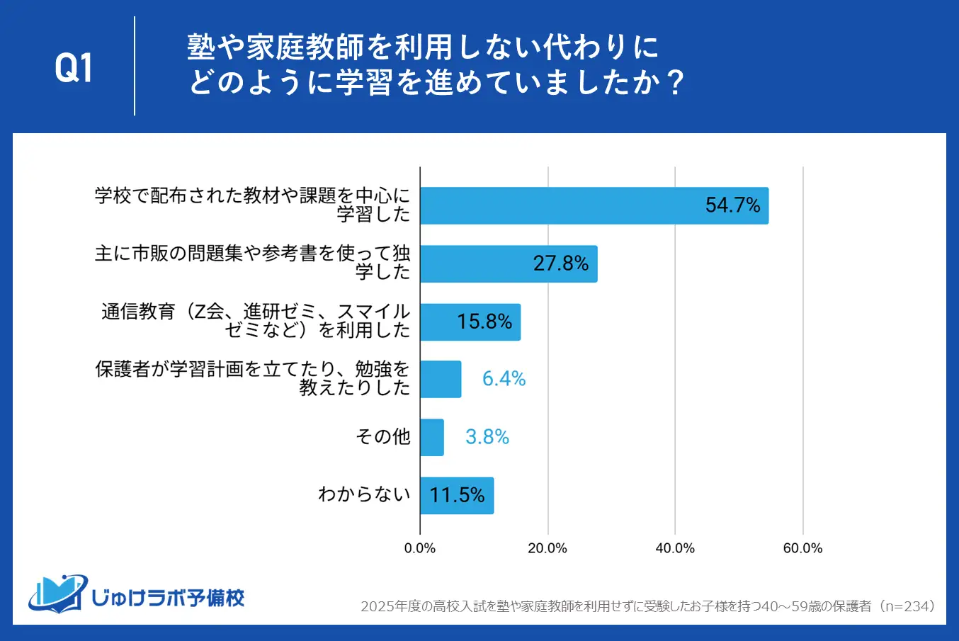 それによると、「塾や家庭教師を利用しない代わりに、どのように学習を進めていたのか」と聞いたところ、過半数(54.7%)の保護者が、学習の中心に「学校で配布された教材や課題」を据えていたことが分かった。