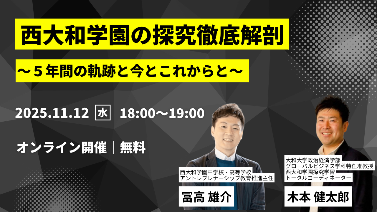 Edv Futureは、オンラインセミナー「西大和学園の探究徹底解剖 ~5年間の軌跡と今とこれからと~」を11月12日に開催することを発表した。