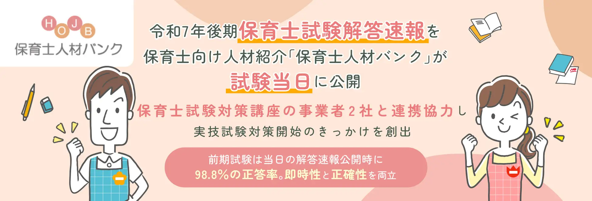 エス・エム・エスは、10月18・19日に実施された「2025年後期保育士試験」の解答速報を、同社の保育士向け人材紹介サービス「保育士人材バンク」で、それぞれ試験当日の夜から公開している。